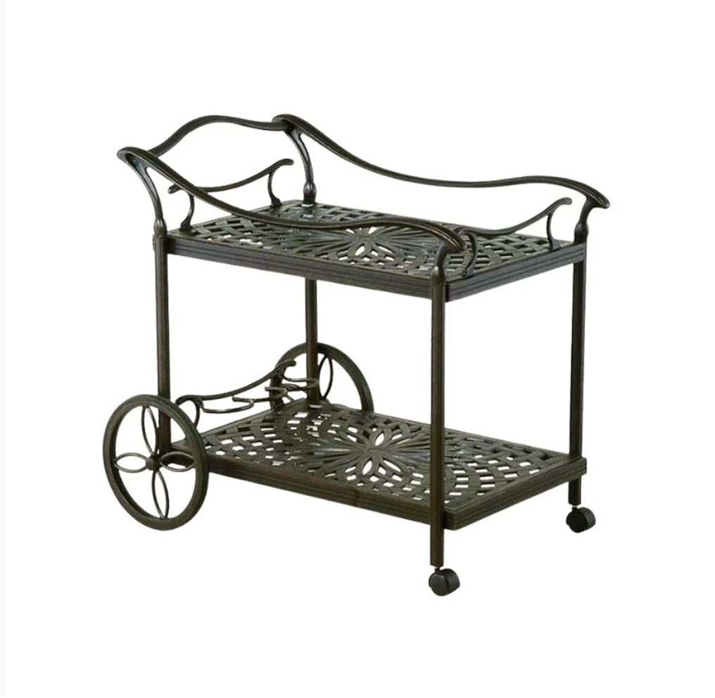 Roll into patio party stardom with the Hanamint Mayfair Tea Cart—your backyard’s new MVP in Desert Bronze! This rust-proof cast aluminum beauty, with its fancy 8-step powder-coated finish, sports a removable tray, a lower shelf with three bottle holders (cheers!), and a snazzy lattice design that’s classier than your average picnic. With two caster wheels and two rubber-tired aluminum wheels, it glides smoother than your best dance moves. Backed by a 10-year structural and 3-year finish warranty, it’s ready to serve drinks and snacks with flair!